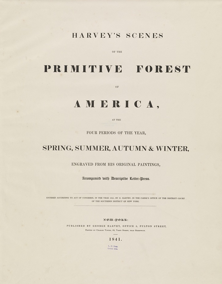 Bennett, W. J. , Engraver, and George Harvey. Harvey’s scenes of the primitive forest of America, at the four periods of the year, spring, summer, autumn & winter, engraved from his original paintings, accompanied with descriptive letter-press, [Title page and Preface]., New York, 1841. Color aquatint and letterpress text (original and detail). Library of Congress. Click to open larger image in new window.