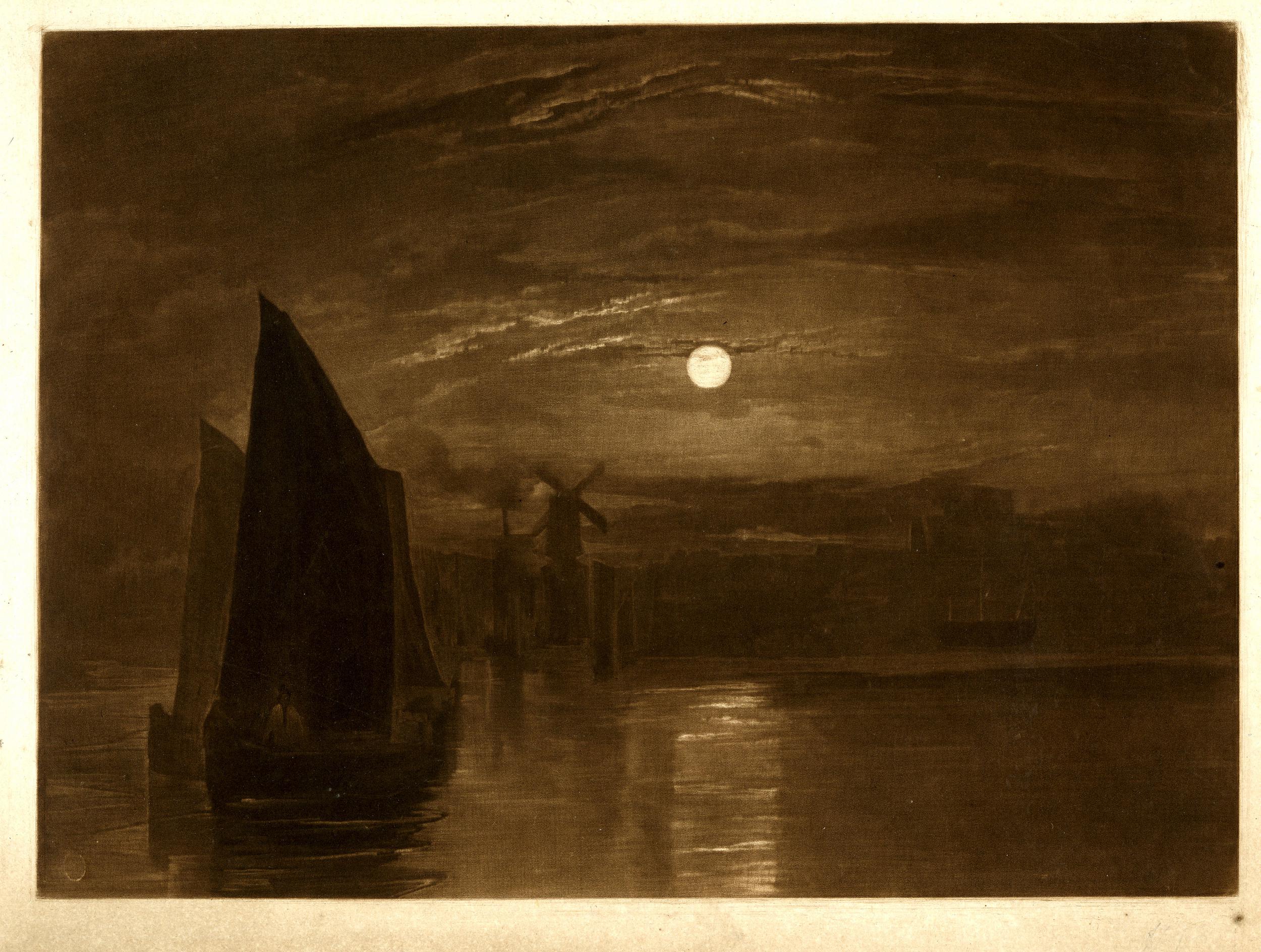 Ascribed to artist Henry Dawe, after J. M. W. Turner, Moonlight on the Medway at Chatham, from series Liber Studiorum, Mezzotint and etching, 1813-1823, © The Trustees of the British Museum, non-commercial use permitted with (CC BY-NC-SA 4.0) license. Click to open larger image in new window.