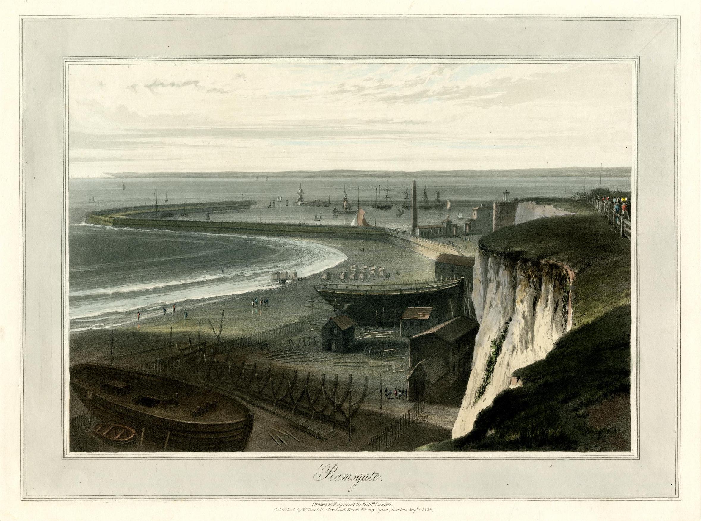 Daniell, William, artist, Ramsgate, from William Daniell and Richard Ayton, A voyage round Great Britain, vol. VII, 1823, aquatint and some etching with hand-colouring. © The Trustees of the British Museum, non-commercial use permitted with (CC BY-NC-SA 4.0) license. Click to open larger image in new window.1