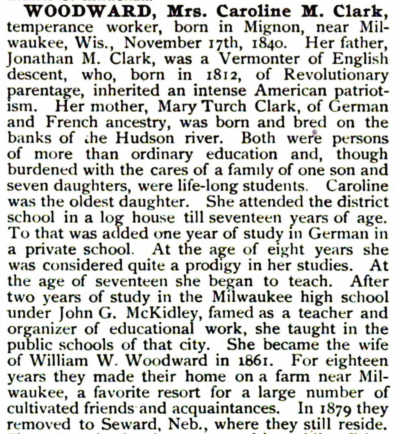 WOODWARD, Mrs. Caroline M. Clark, temperance worker, born in Mignon, near Milwaukee, Wis., November 17th, 1840. Her father, Jonathan M. Clark, was a Vermonter of English descent, who, born in 1812, of Revolutionary parentage, inherited an intense American patriotism. Her mother, Mary Turch Clark, of German and French ancestry, was born and bred on the banks of the Hudson river. Both were persons of more than ordinary education and, though burdened with the cares of a family of one son and seven daughters, were life-long students.