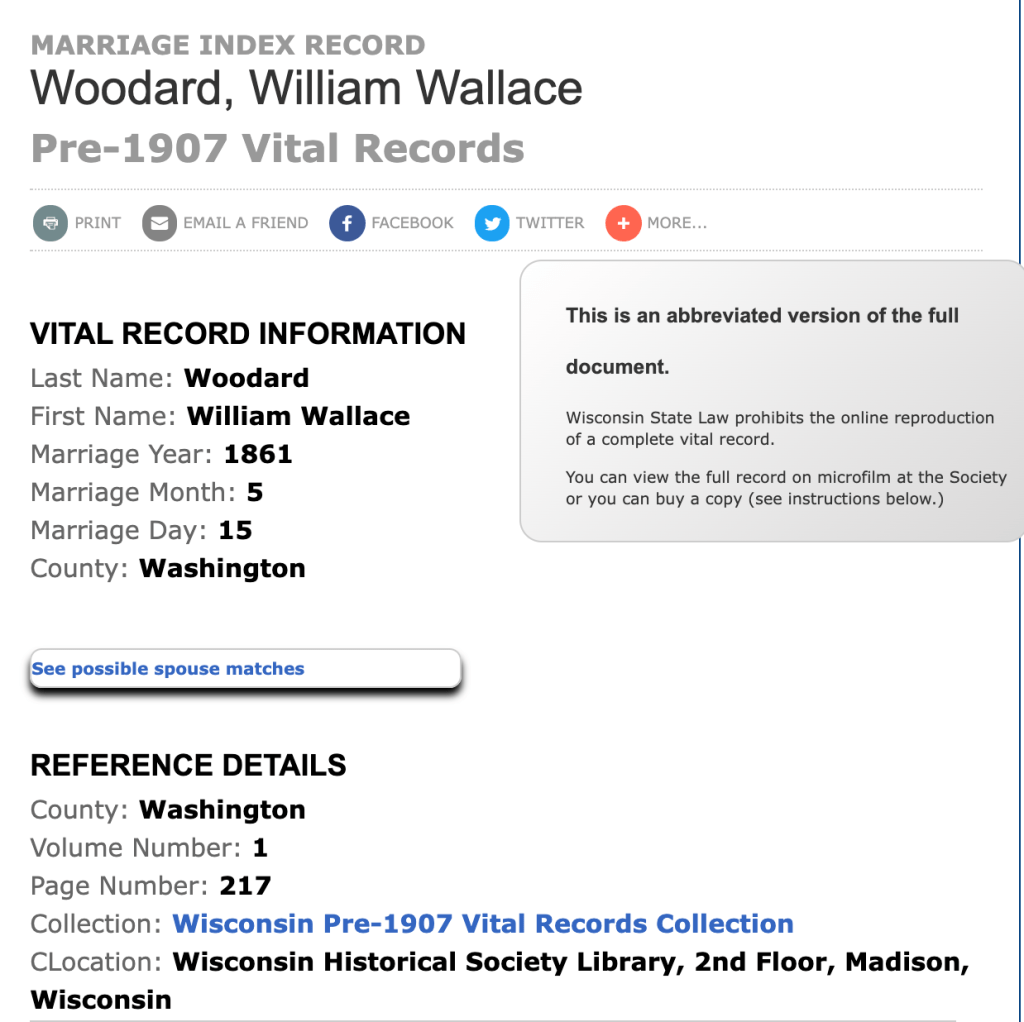 We know from many, many other records that Caroline Clark married W. W. Woodward, not Woodard, in 1861. Either William’s last name was spelled incorrectly on the original Washington County marriage record, or it was misspelled when the WHS database was prepared. Except for William’s surname, all the marriage information in the WHS database matches for both Caroline and William: marriage year, month, date, county of marriage and location of the marriage record itself.