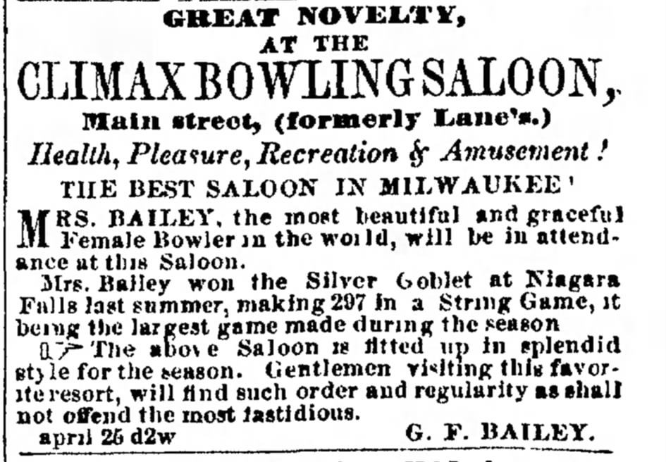 Hmmm… Perhaps a gentleman sharing a lane with Mrs. Bailey, the “most beautiful and graceful Female Bowler in the world,” at Milwaukee’s Climax Bowling Saloon was a bridge too far?