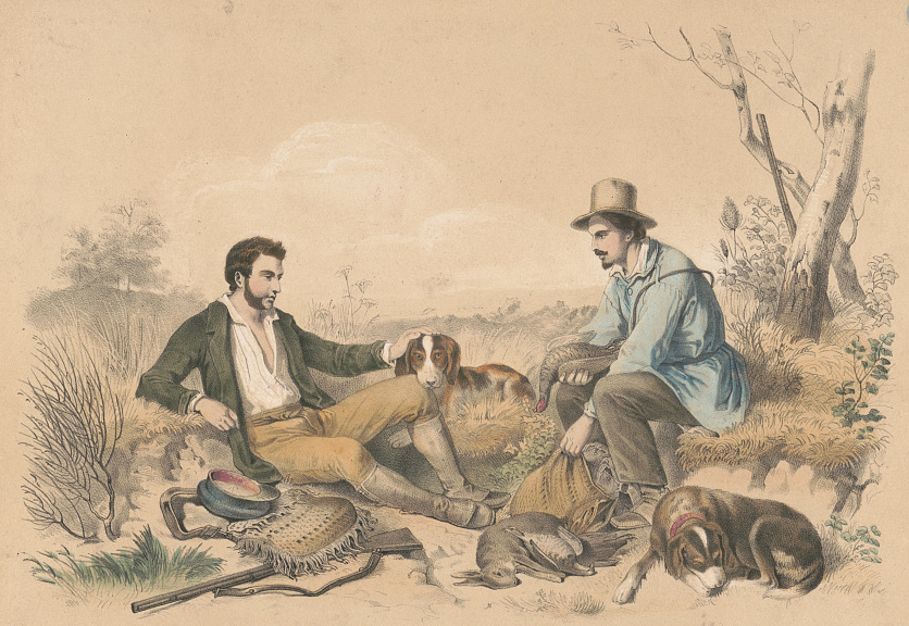 Unknown artist, Two Hunters and Their Dogs Resting After Hunting Rabbits and Birds, Place not identified: publisher not identified, between 1830 and 1860, lithograph. Library of Congress, public domain. Click to open larger image in new window.