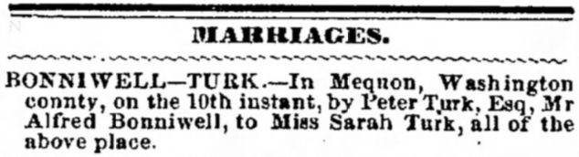 BONNIWELL—TURK.—In Mequon, Washington county, on the 10th instant, by Peter Turk, Esq, Mr Alfred Bonniwell, to Miss Sarah Turk, all of the above place.