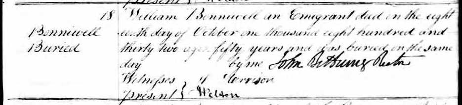 William Bonniwell an Emigrant died on the eighteenth day of October one thousand eight hundred and thirty two aged fifty years and was buried on the same day by me, John Bethune Rector