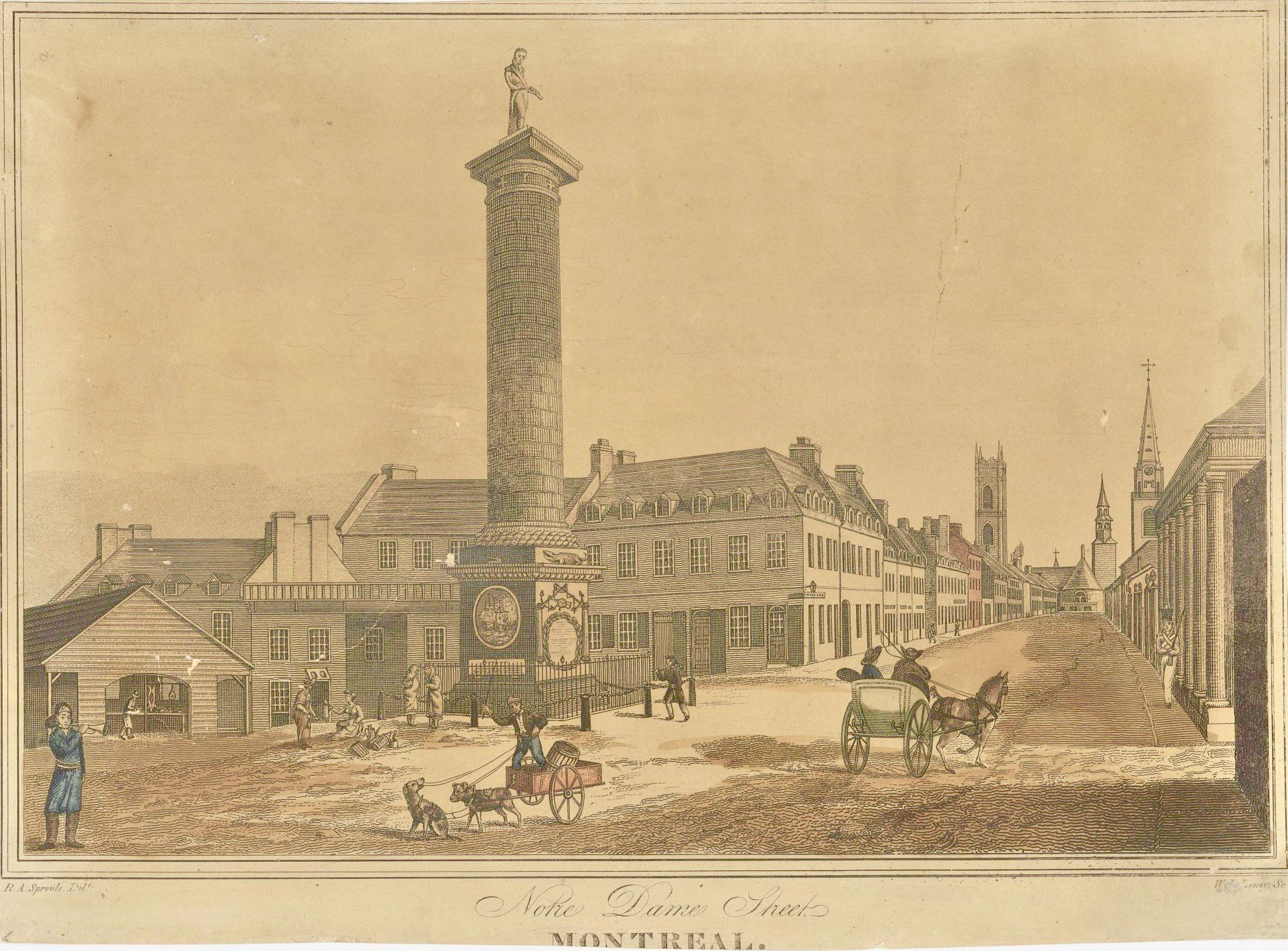 Leney, W.L. and Robert A. Sproule, Notre Dame Street, Montreal, 1830, Montréal, A. Bourne, 1830, BAnQ, slightly cropped and color adjusted. Click to open larger image in new window.