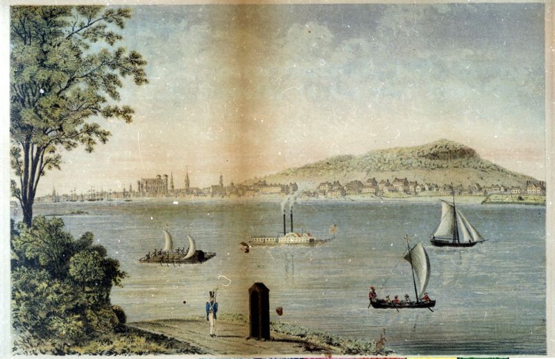 That’s the city of Montréal in 1830, as seen across the St. Lawrence River from Saint Helen’s Island. Take a moment to click and open the larger version of this image and note the many kinds of water transport on the river. From left to right there is a raft or ferry with 10 men rowing and two sails, a side-wheel steamboat, a large rowboat with single sail (most likely one of two types of boat: either a Mackinaw boat or a bateau), and a single-masted sloop with two jib foresails and a gunter- or gaff-rigged mainsail. It looks like the ferry is arriving or departing from the guarded booth at the end of the road at foreground, center.5