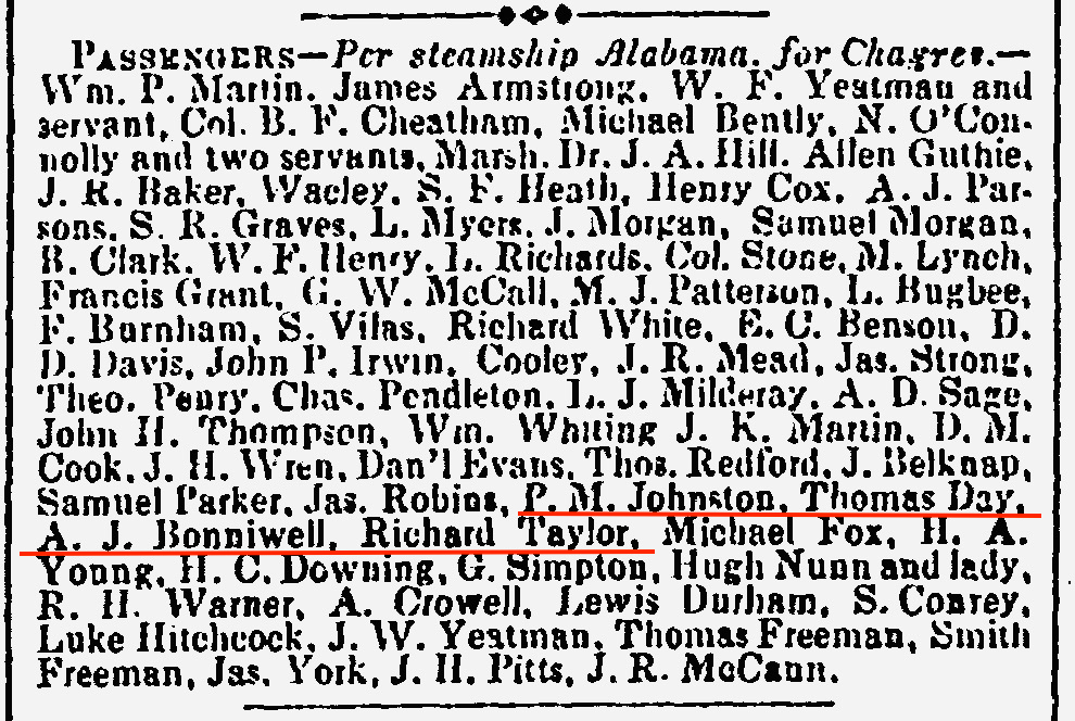 What is relevant for us, is Allen’s statement that “P. M. Johnson and Day, of Grafton, are here.” P. M. Johnson is, as we have learned, a co-investor, with William Bonniwell, in the 1850 overland expedition, and a passenger on the voyage from New Orleans to Chagres in 1849. The other man, “Day, of Grafton,” is probably the same “Thomas Day” listed with the passengers on the Alabama, and sailed to Chagres with P. M. Johnson and the others.