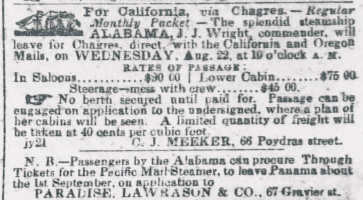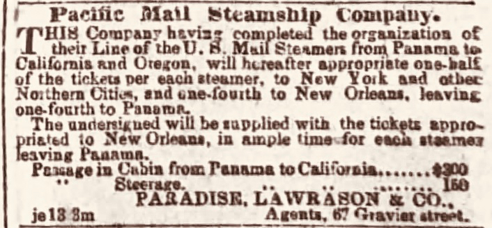 “Pacific Mail Steamship Company,” advertisement, New Orleans Daily Crescent, Wednesday, 12 Sept 1849. p. 3, newspapers.com, accessed 27 May 2022.