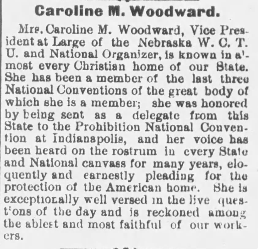 Caroline twice stood for election to statewide office in Nebraska. Although most American women—including Caroline—would not be granted the right to vote until 1920, in the 1890s Caroline Woodward appeared on the Prohibition Party ticket in two state elections. In 1891 she ran for regent of the state university, and in 1894 she sought election as representative for Nebraska’s fourth congressional district.