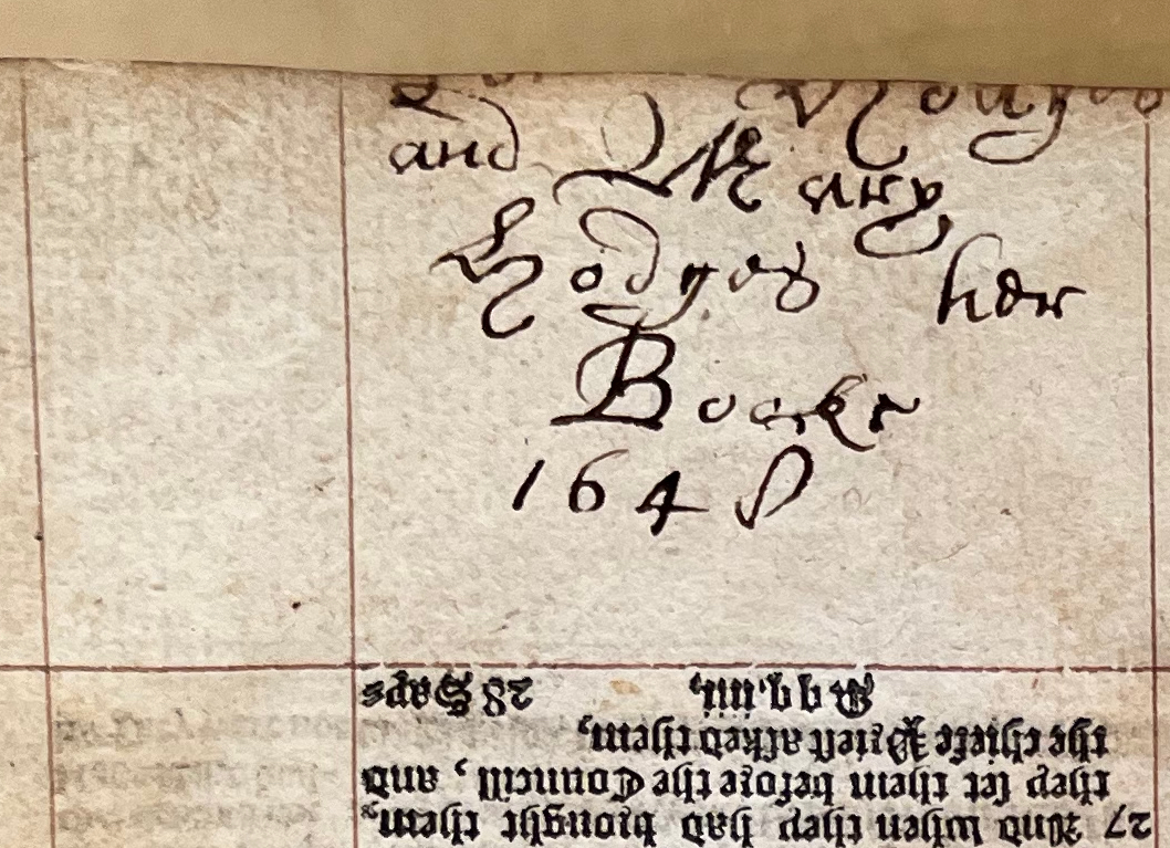 If you compare the trimmed-off first line of the inscription with the undamaged Hodges of Mary Hodges her Booke, then I believe the full inscription should read: