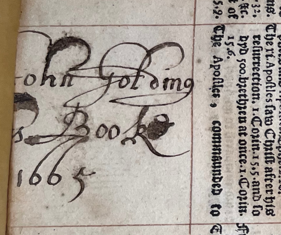 Bonniwell Bible, inscription of previous owner Golding, 1665, in margin below Second Table (of Concordances), page ANG to ARK. Photo credit: Reed Perkins