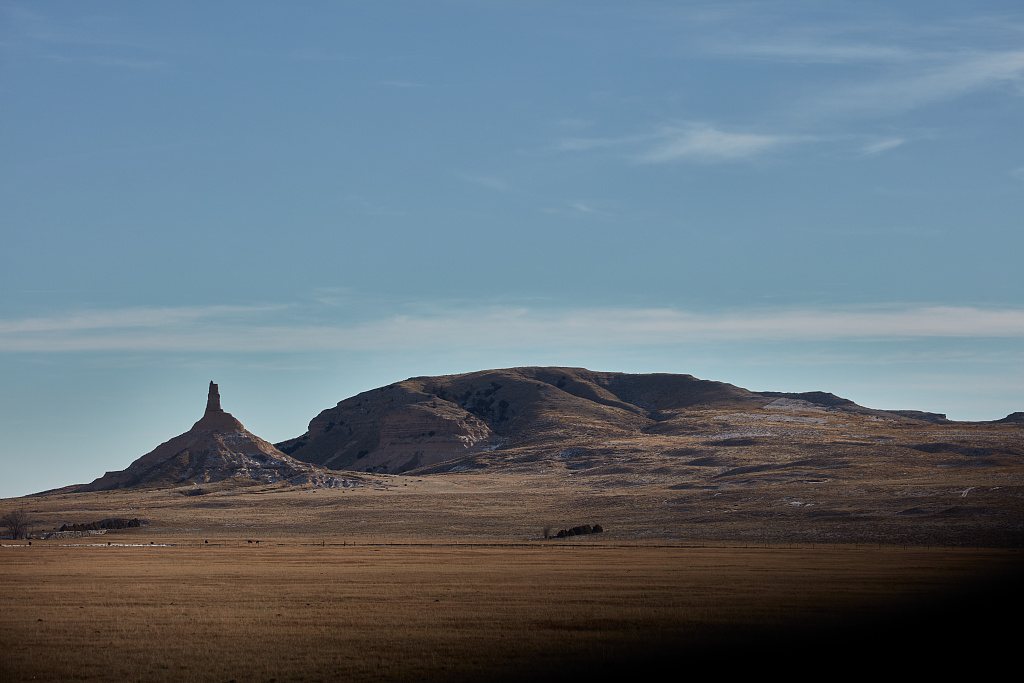 Highsmith, Carol M, photographer. The iconic Chimney Rock, now a U.S. national monument, stands out in the distance in Morrill County, Nebraska. United States Nebraska Morrill County, 2022-01-02. Library of Congress (public domain).
