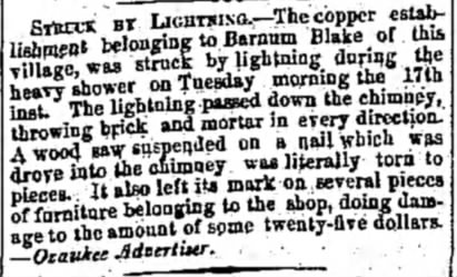 It wasn’t always smooth sailing for Ozaukee’s (most?) successful barrel maker. On April 17, 1855, Blake’s “co[o]per establishment” was hit by lightning…