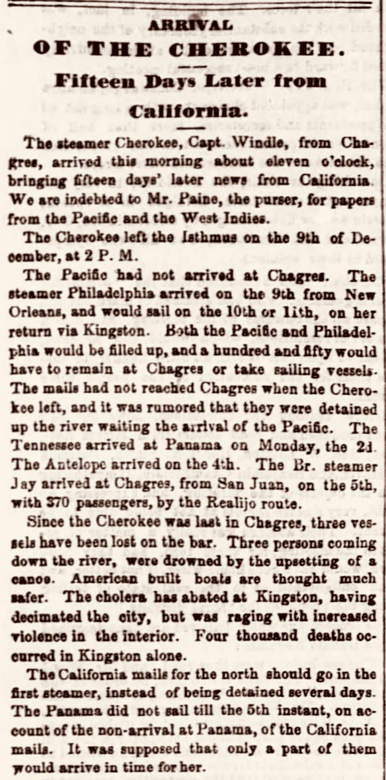 - The second headline, “Fifteen Days Later from California” suggests that the Pacific steamer from San Francisco left there on December fifth and made a direct line for Panama (City) with no extended stops along the way. Then the passengers, and freight, made a quick crossing of the isthmus by foot and canoe, and were then able to board the Cherokee before it departed Chagres on December 9th. This seems implausible and, in fact, the Evening Post’s description of the comings aand goings of the steamers at Chagres is rather confusing.