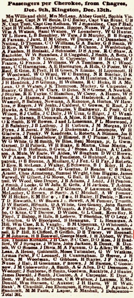 The New York Evening Post did not publish the names of all the passengers on a given ship. The names of steerage passengers—the economy-class travelers of the day—were usually omitted from published passenger lists. So, when we read down and find our men, listed here as “P M Johnson” and “H B Bonwell” [sic], we can assume they traveled in a more comfortable, and expensive, class than steerage.2