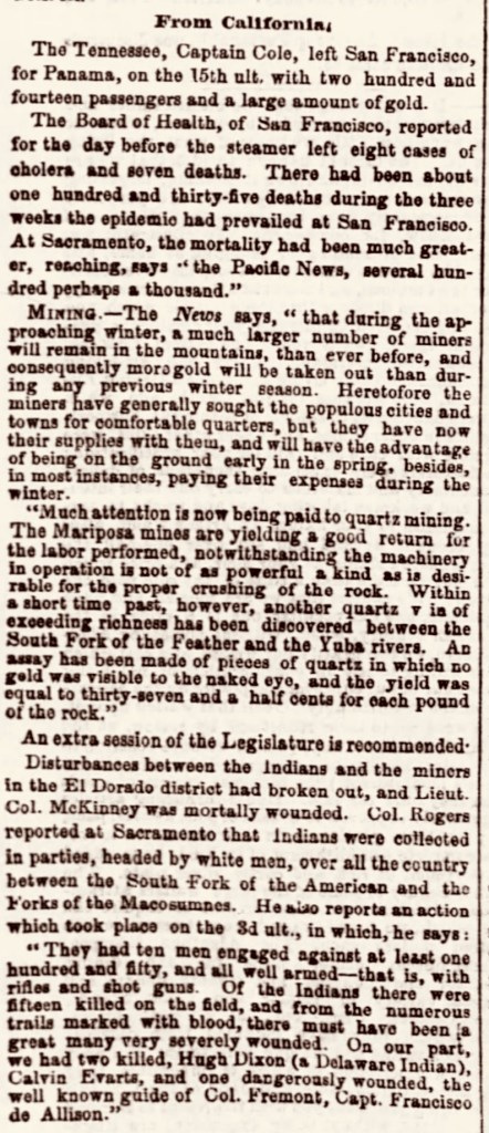 This roundup of “From California” news features many of the topics most popular with 19th-centuy readers. After beginning with some shipping and gold dust news, the column outlines the cholera deaths in San Francisco and Sacramento. “Mining” news occupies the next two paragraphs.