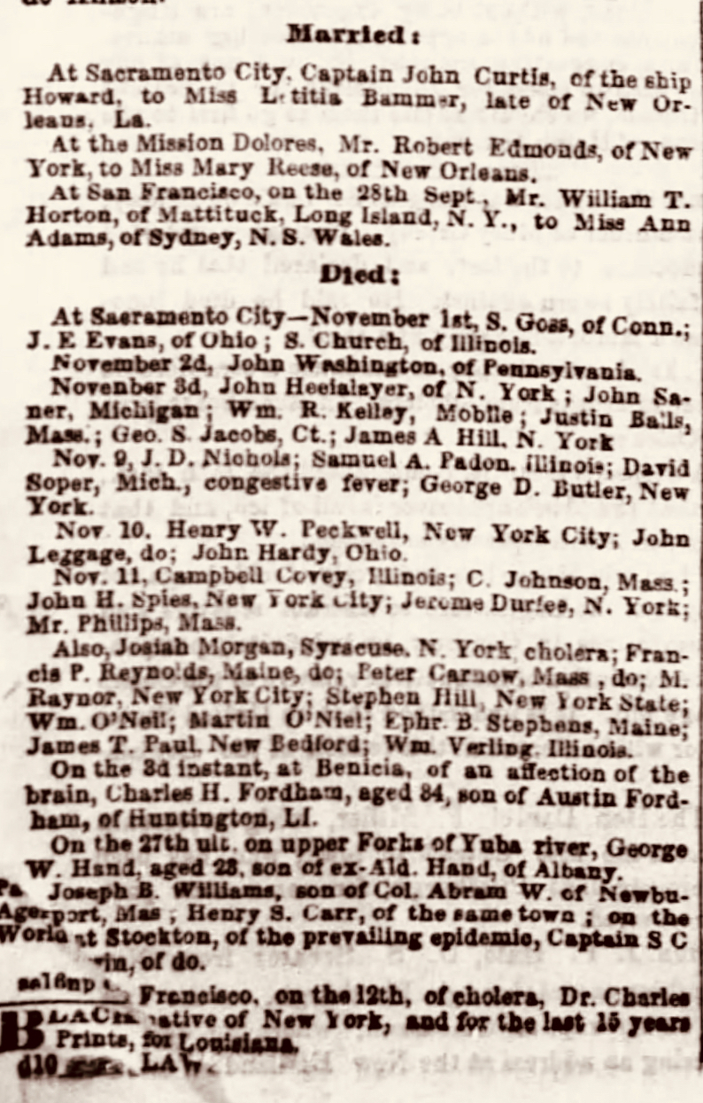 The California papers can also be a unique and valuable source of what we would consider “vital statistics.” In an era when local governments were not yet systematically collecting birth, marriage, and death (BMD) records, some (but not all) of these events would be recorded and printed in local papers, and some of those notices (but not all) would be reprinted elsewhere. If you are looking for gold rush era information about an ancestor’s BMD facts, you might consider searching through the newspapers of the day. It’s a long shot, but could be worth the trouble.