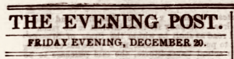 Today’s Clark House Historian post uses just one of these gold rush articles as its source. The original article occupied the complete first column (and a bit of the second) of page 2 of the Friday evening, December 20, 1850, New York Evening Post. There’s a lot of news packed into the original article; to make that news easier to digest, I have divided the unbroken column of type into several smaller parts. Let’s take a closer look…