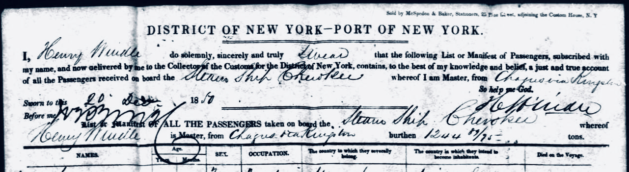 Well, once a news report suggests a probable ship, date, and port of arrival, we can start looking through the surviving passenger manifests for that ship, on that day, at that port. Here’s the top of the first page of the Cherokee’s actual hand-written passenger manifest from a microfilmed collection of originals in the collection of the National Archives.3