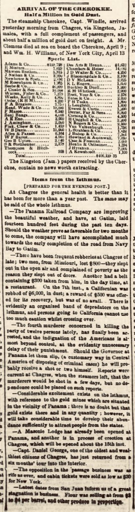 The arrival of the steamship Cherokee, with “Half a Million in Gold Dust” was also chronicled on page 2 of the April 21, 1851, New York Evening Post. The Evening Post’s article omits the passenger list, but provides more complete coverage of breaking news from the Isthmus of Panama, and includes news of two deaths at sea aboard the Cherokee. Other news included a report of intense competition for eastbound trans-continental passengers, with a subsequent drop in ticket prices, such that “cabin tickets were sold as low as $30 for New York.”