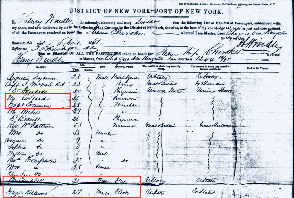 A look at the beginning part of page 1 of the Cherokee’s April 21 [sic], 1851, passenger manifest will clear things up: