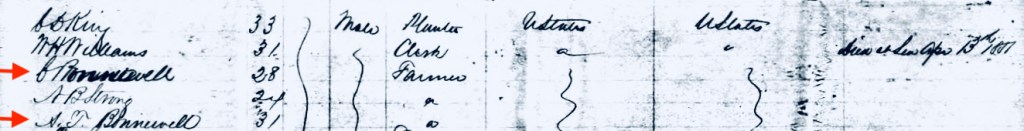 The red arrows mark the names of our two returning Bonniwell men. The second marked name is clearly that of “A T Bonniwell” (or, perhaps, “Bonnewell”), age 31, male, a farmer by occupation, and a U.S. citizen returning to the United States. This is certainly Alfred T. Bonniwell, although with a birthday of April 1, 1826, he would be more accurately listed as a bit over 25 years old, an odd, but common discrepancy in these lists.
