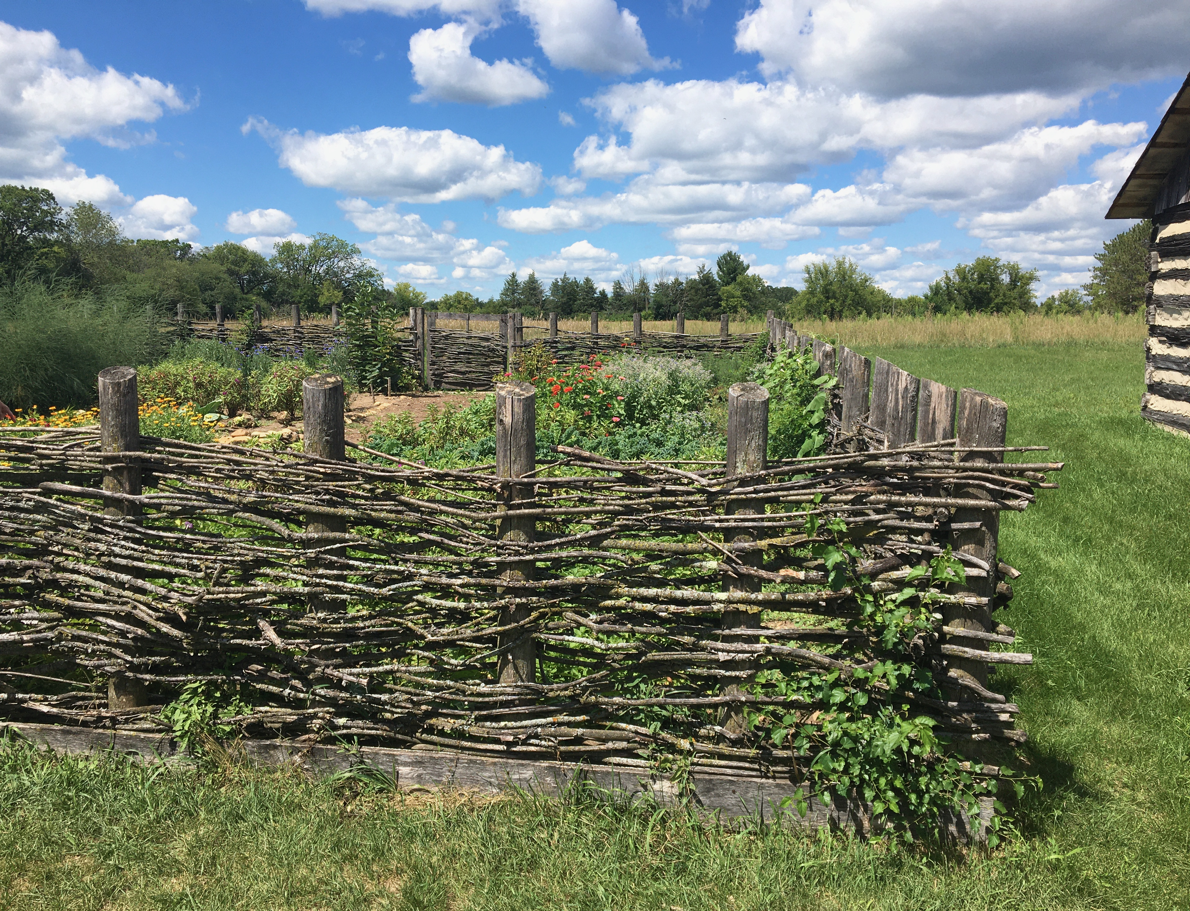 It’s one thing for us 21st-century gardeners to head down to the big home center and pick up some steel fence posts and rabbit wire when we want to build a fence, but what did our Mequon settlers do when they wanted to enclose a garden and keep the critters out? Here’s one approach that I saw last summer at the flower and vegetable garden at Old World Wisconsin’s 1870s Hessian Immigrant Farm: