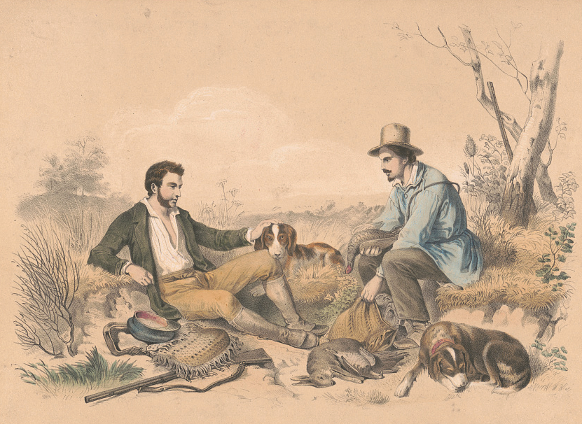 Unknown artist, Two Hunters and Their Dogs Resting After Hunting Rabbits and Birds. [Place not identified: publisher not identified, between 1830 and 1860] Library of Congress.