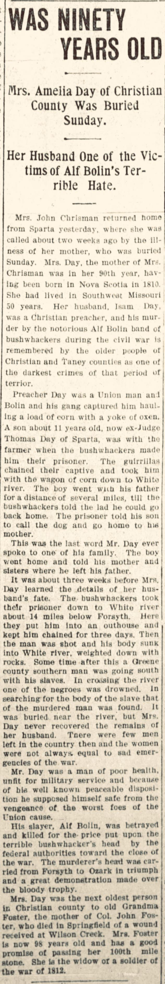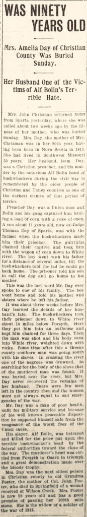 Isham Day was married to Amelia (or Emily) Bigelow in Illinois in 1833. She was yet another member of the extended Nova Scotia Bigelow family that figured prominently in Mequon’s early days.7 When Amelia Day died in in the last days of the nineteenth century, she was celebrated as the second-oldest resident of Christian county, and received a long and detailed obituary in the Springfield Leader and Press, Springfield, Missouri, on Tuesday, December 26, 1899. Ironically, only a few of that obituary’s words and details were about the deceased. Instead, most of the obituary describes—at length—the notorious murder of Amelia’s late husband, Isham Day, some 37 years before: