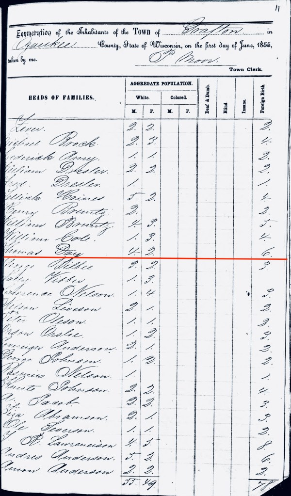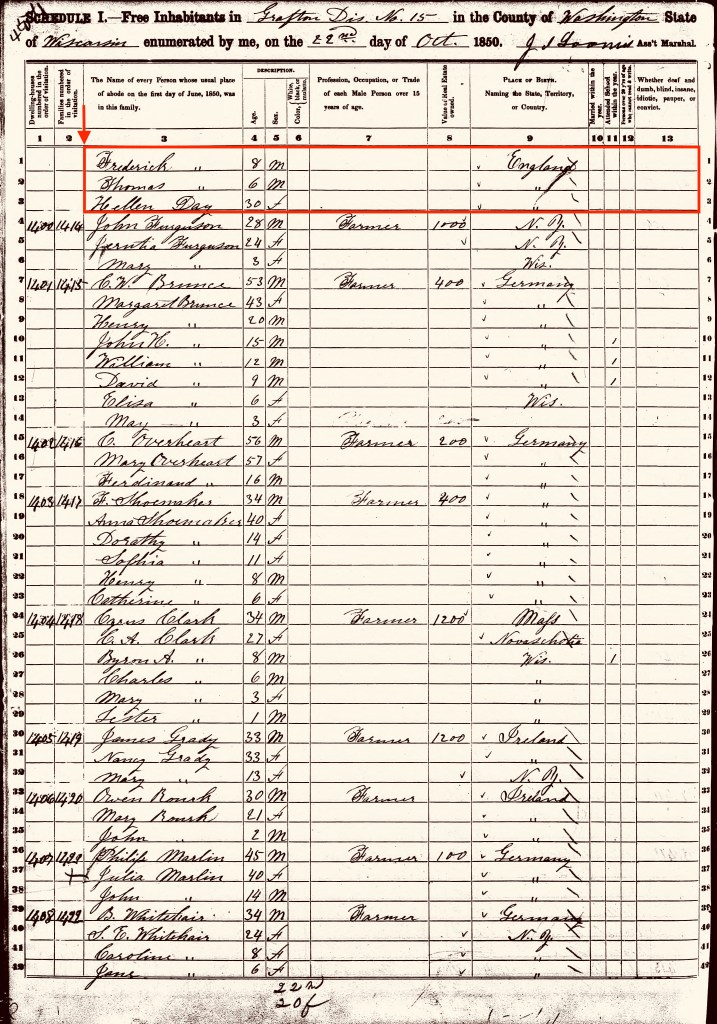 Thomas Day was still living in Grafton, Ozaukee county—presumably still farming—according to the Wisconsin state census for 1855. The Thomas Day household was comprised of 4 white males and 2 white females, all of foreign birth. Three of the males were presumably Thomas and his two sons. Sister Eleanor/Hellen Day was probably one of the two females. Who were the other two? Perhaps brother John Day and John’s wife Mary? We don’t know.