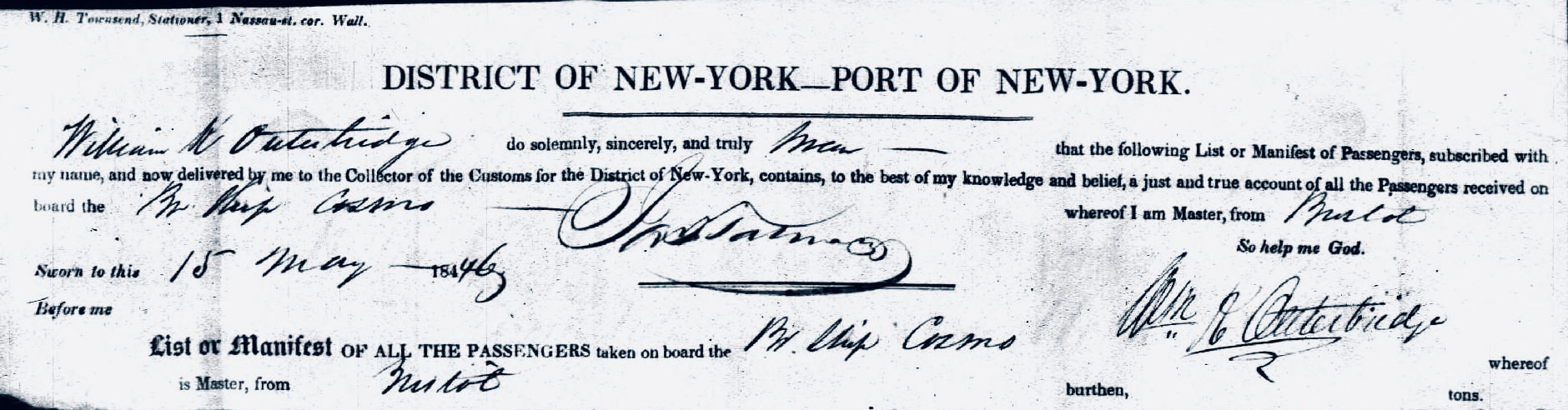 Day’s obituary states that he immigrated to the United States in 1847. It appears that he actually arrived a year earlier, on the British brig Cosmo, sailing from Bristol, England, arriving at the Port of New York on May 15, 1846: