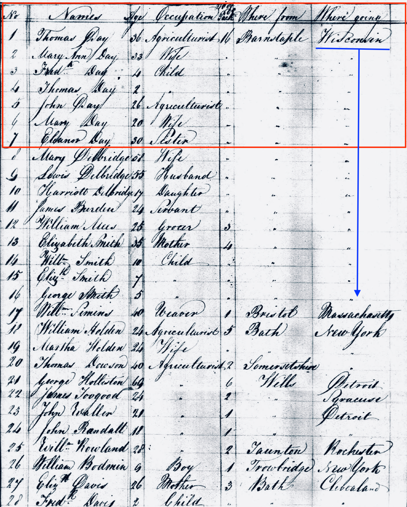 Thomas Day did not emigrate alone. He was part of a group of 16 emigrants leaving Barnstaple, Devon, and heading to Wisconsin (see vertical blue arrow):