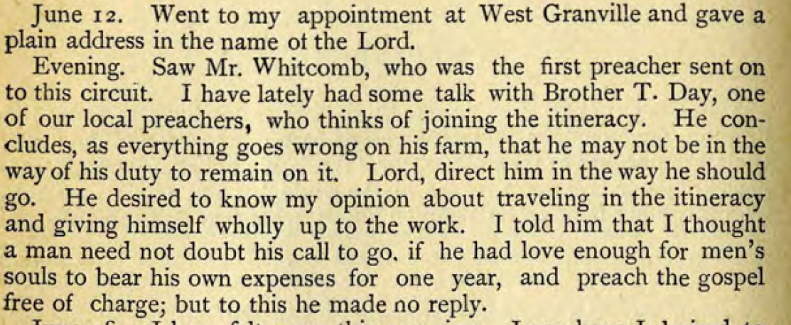 Clark House neighbor—and fervent Methodist preacher—James W. Woodworth mentions “Brother” Thomas Day several times in his published diary. This passage, from June 12, 1853, is particularly informative: