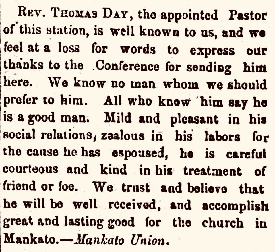 According to his obituary, Thomas Day “became a regularly ordained minister of the Methodist Episcopal Church” in 1856. And in 1857 he was “admitted to the Minnesota Conference” [of the Methodist Church] and assigned to a post in Red Wing, Minnesota. This was the first of several successful church building assignments that Day would undertake in Minnesota.4