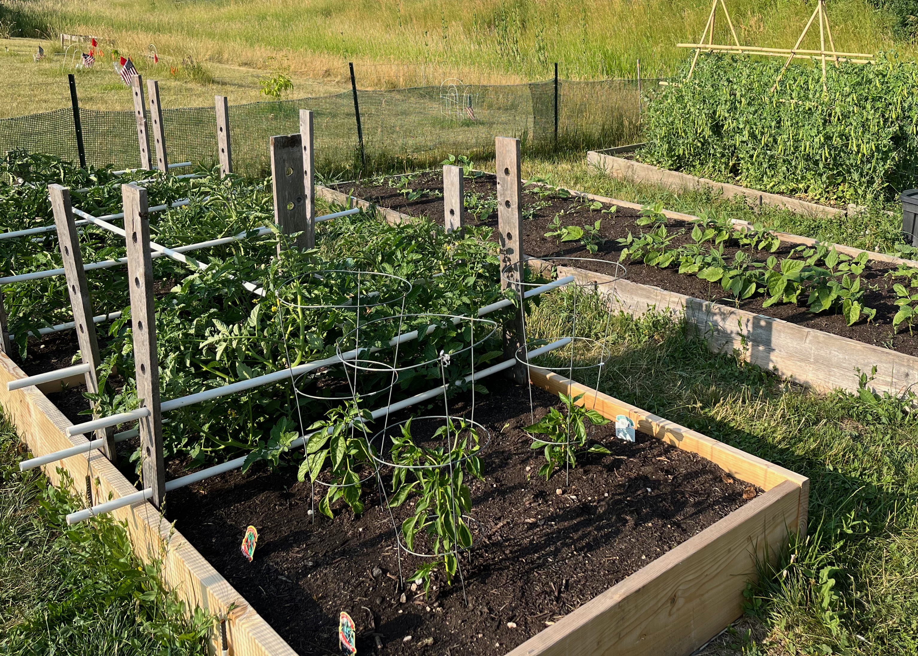 Peppers, tomatoes, green beans and peas in the vegetable garden, mid-June, 2023. Photo credit: Laura Rexroth.