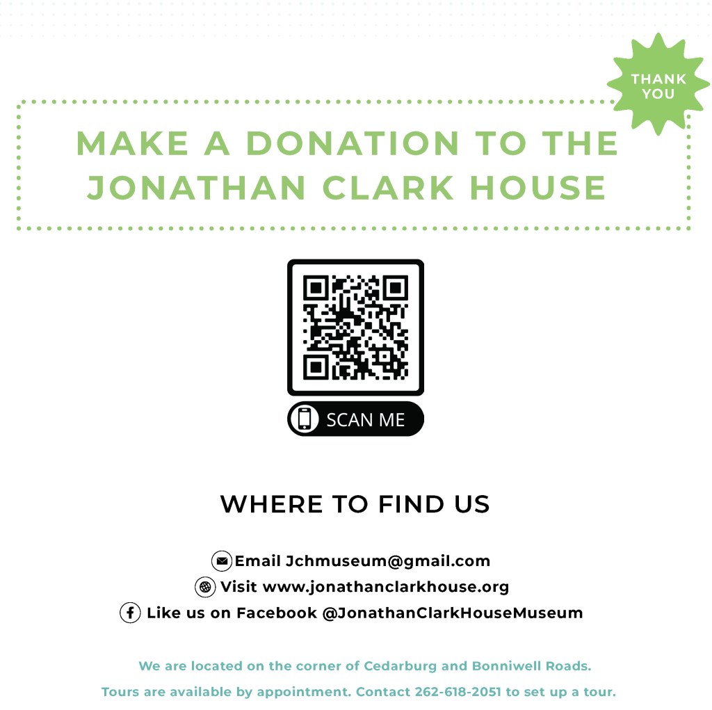 I’d be remiss if I passed up the opportunity to ask you to support the Jonathan Clark House Museum. As always, we appreciate the many gifts, large and small, from all of our supporters. Your contribution, of any size, supports the museum and its many educational and outreach activities. And now giving—and choosing which optional Jonathan Clark House items or programs you might like to sponsor—is as easy as pointing your phone at a QR code: