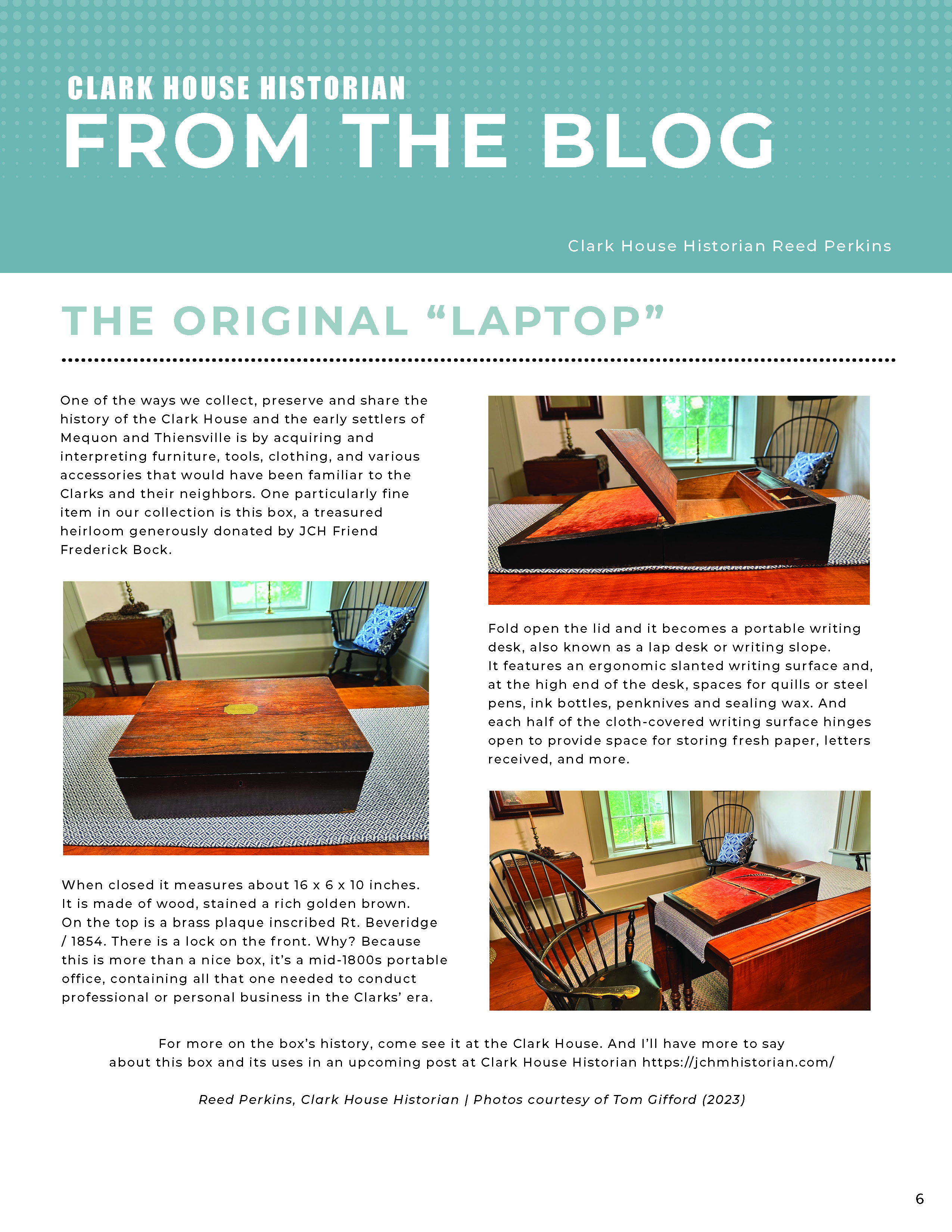 We have a lot of interesting historical objects in the Clark House collection, and this portable writing desk is one of the more special among them. Museum director Nina J. Look asked me to do a little research and write a short piece about this for the newsletter, and the results are above, accompanied by Tom Gifford’s excellent photos.