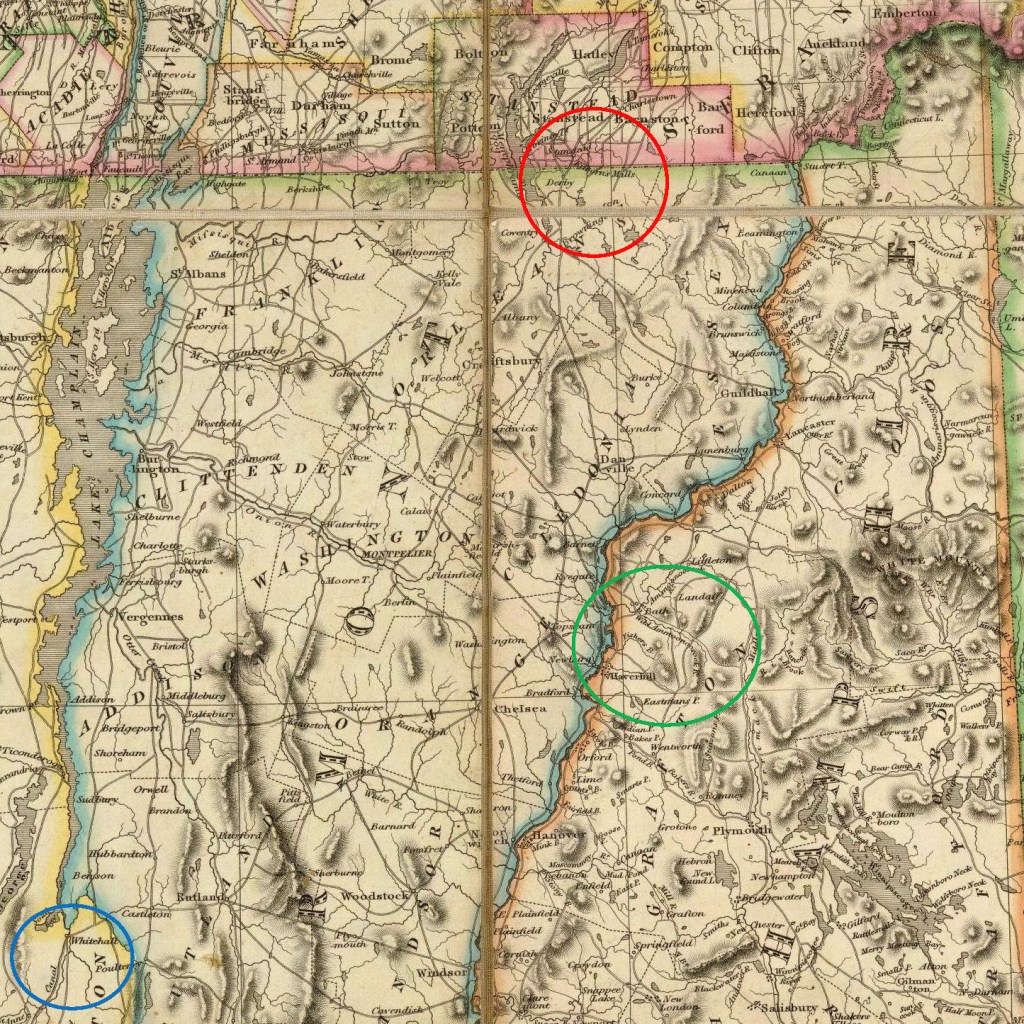 And for a sense of perspective, in the lower left corner of this detail I have highlighted with a blue circle the village of Whitehall, New York, the Empire State’s port of entry at the south end of Lake Champlain and at the north end of the Champlain Canal. Click the links for more about Whitehall’s role in Clark House history.
