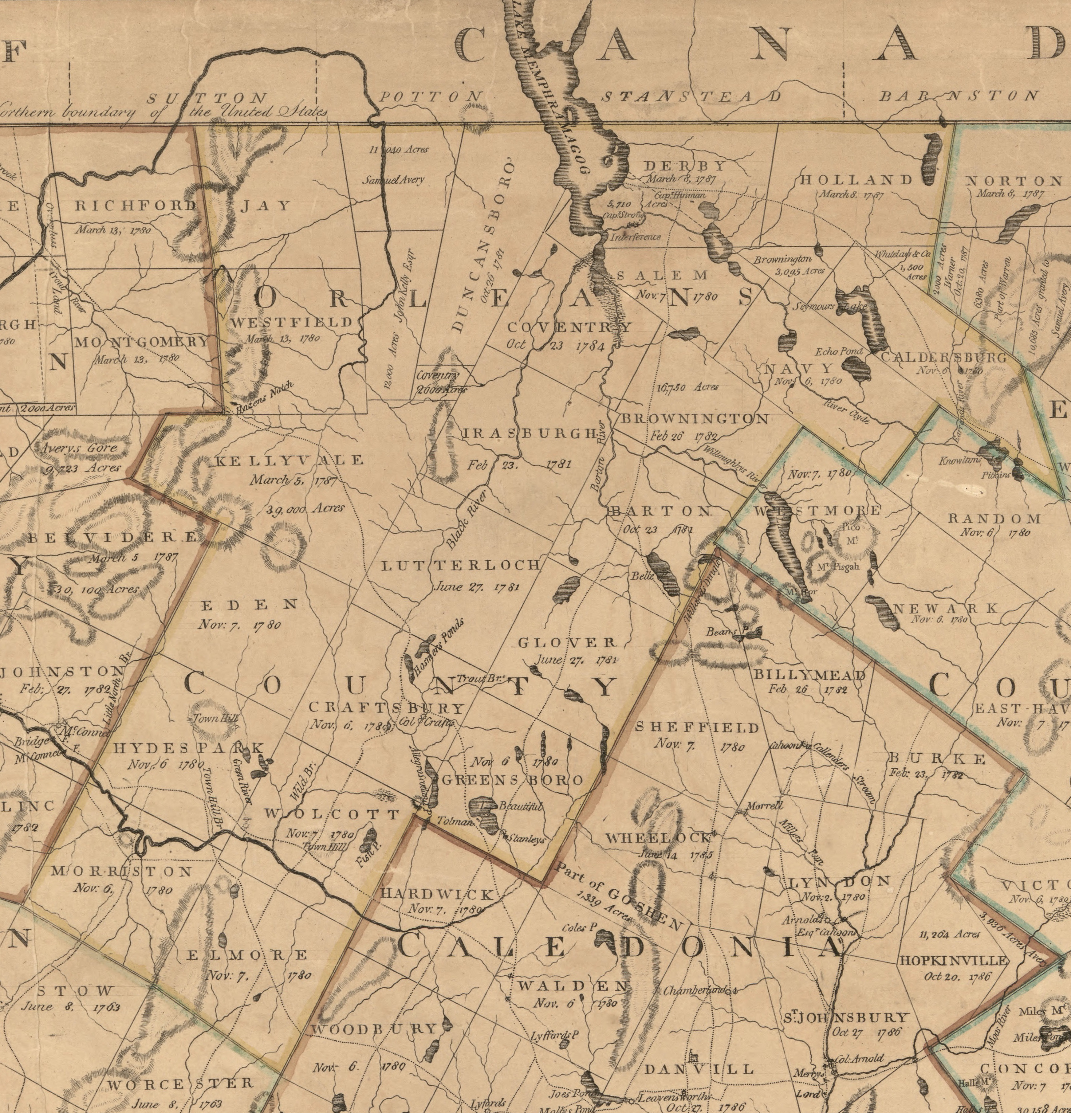 Orleans County, Vermont, was created from Chittenden and Orange counties in 1792. Its northern boundary is the 45th parallel, the international boundary with Lower Canada.3 Orleans county is adjacent to all or part of four of Lower Canada’s Eastern Townships: Sutton and Potton to the west of Lake Memphremagog, and Stanstead and Barnston to the east. On the this detail from our map, Orleans county is outlined with a faded yellow highlight.