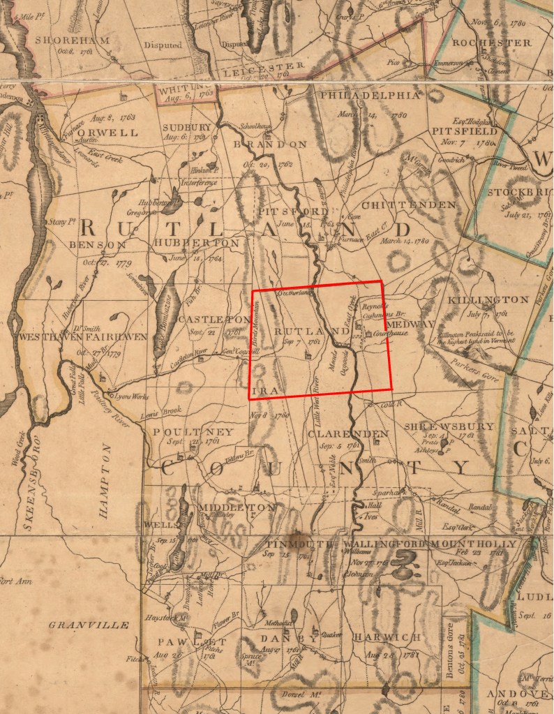 The 1792 Stanstead associates petition was signed in Rutland township, Rutland county, Vermont. Rutland county is in the southwest part of the state, less than 30 miles east of Whitehall, New York, via Fairhaven and Castleton. In the map detail (below), Rutland county is outlined in faded yellow shading; near its center, Rutland township is outlined in bright red.