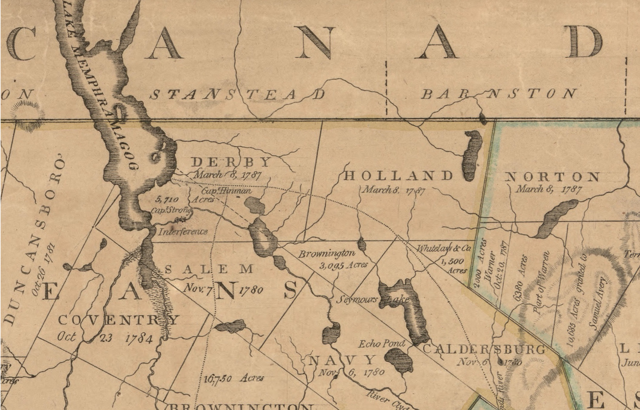 If we zoom in further, we clearly see how the neighboring townships of Stanstead, Lower Canada, and Derby, Vermont, are closely linked by geography, especially the vital water transportation routes and fresh water resources of Lake Memphremagog. We can also see that the initial land grant for Derby was not made until 1787. Derby, like most of Vermont’s northern townships, was not surveyed and settled until several decades after the initial grants were awarded for Vermont’s southern townships.