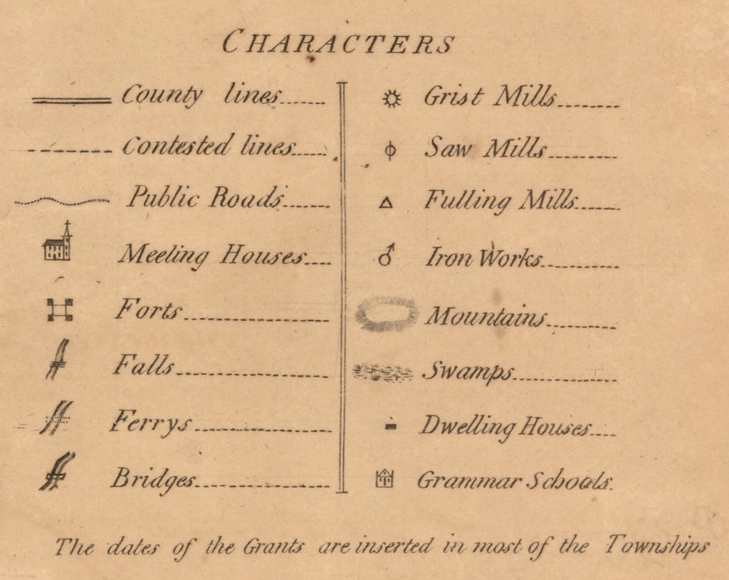 There are many interesting historic maps of Vermont online. I chose this map, in part, because it manages a nice balance between precise detail and not being too visually cluttered. It shows all the county and township names and boundaries and, as the map key notes, “The dates of the [land] Grants are inserted in most of the Townships.” Along with the dates of the grants, most townships include the number of acres in the original grant, as well as the names of the original grantee(s) or other notable settlers or landowners.