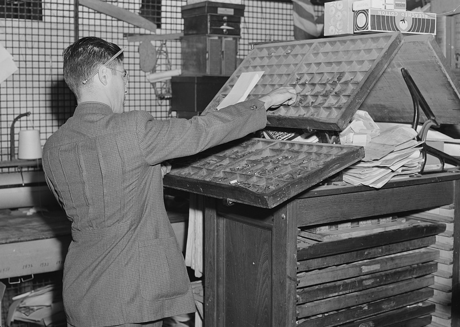 • Lee, Russell, photographer. Setting type by hand. Newspaper office. San Augustine, Texas, April, 1939. Library of Congress.