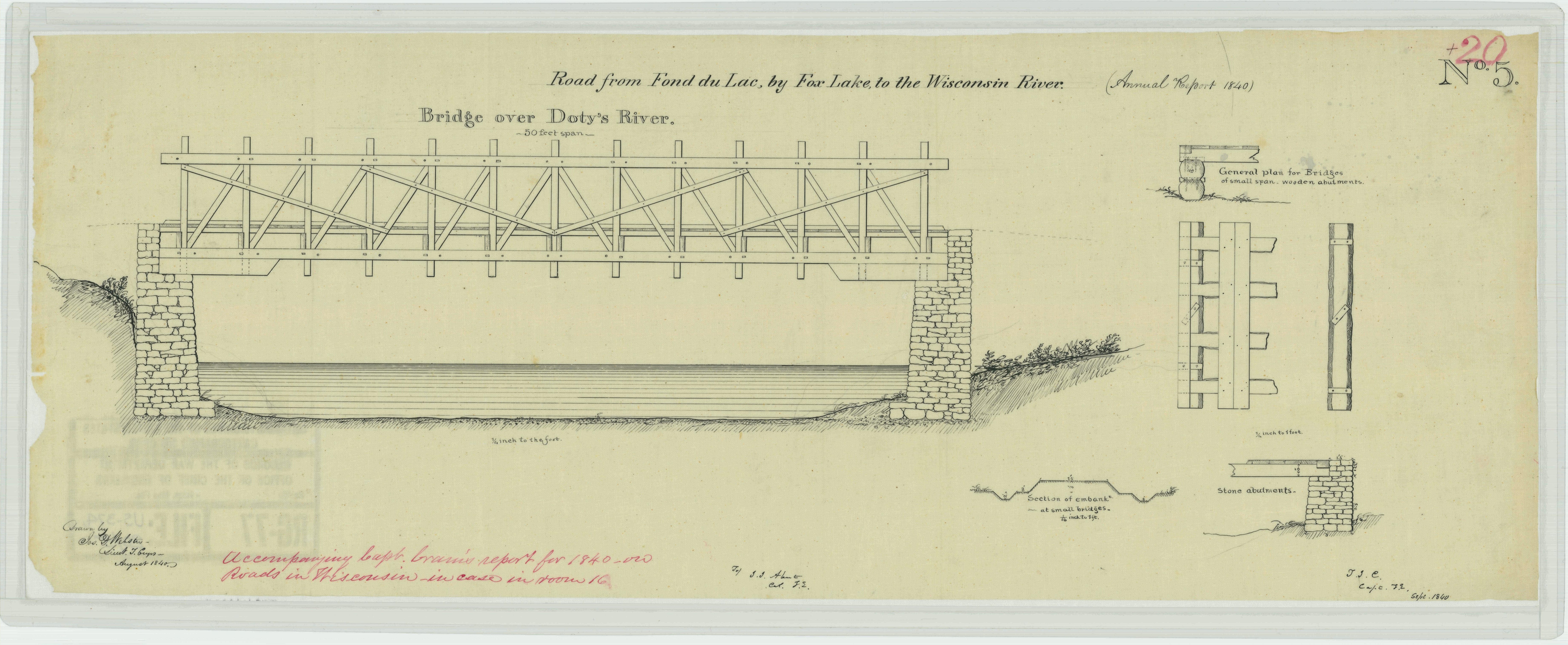 Our first image (above), was part of a larger document, cataloged at NARA as “Road from Sauk Harbor to Dekorre (Wisconsin).” The full drawing (below) includes additional examples that show the difference between the simple, shorter, bridges used on various 1840 federal roads in Wisconsin—such as these along the Green Bay road—and the new, “high-tech” truss style bridges used to span wider rivers and streams elsewhere in the territory. The drawing is worth zooming in on. There are detailed lists of the sizes and quantities of lumber employed, a “Bill of Iron,” detailing the spikes and bolts used on the bridge, and drawings showing the contour of the road embankments as they approach the bridge site.