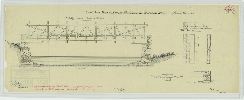 We close with three related drawings, sharing similar NARA catalog titles. All three drawings detail aspects of the southernmost east-west federal road in Wisconsin Territory, 1840. For more on this road, and its starting and ending points, see our Monday: Map Day! – Wisconsin’s Federal Roads in 1840, and be sure to zoom in on the companion map.