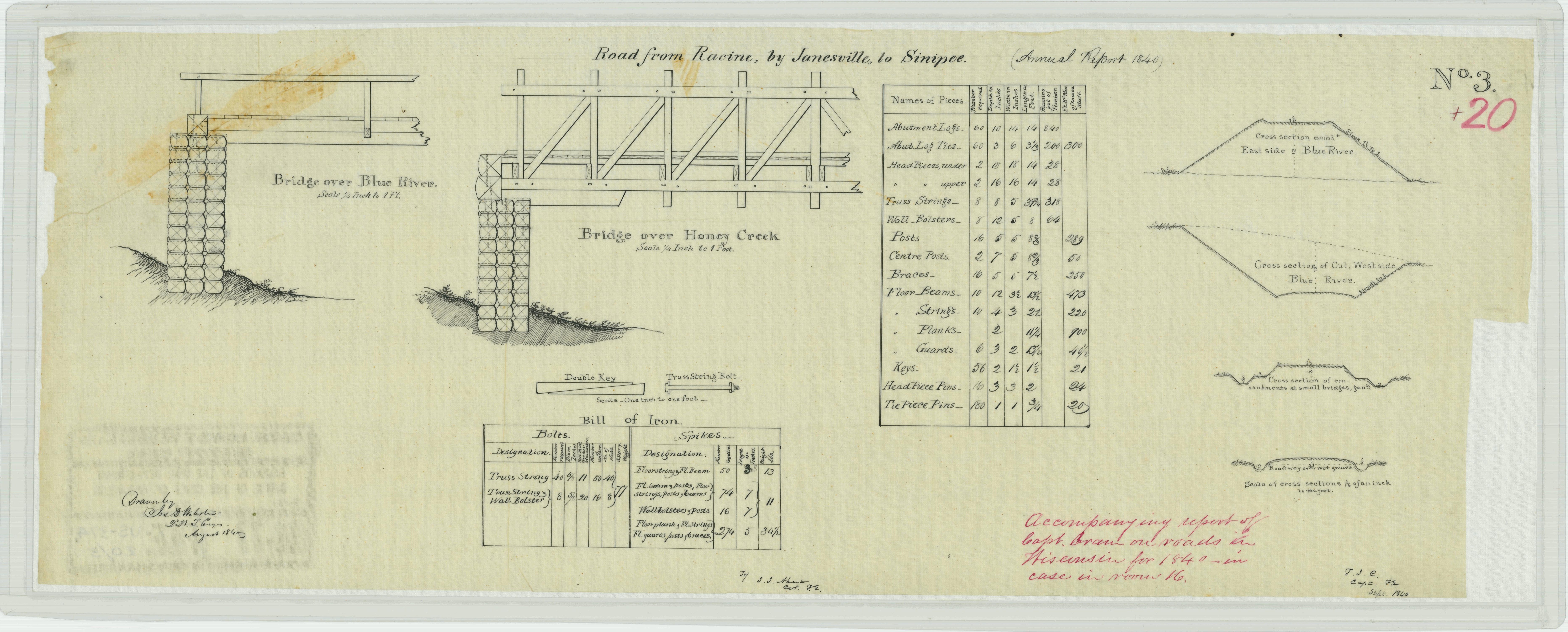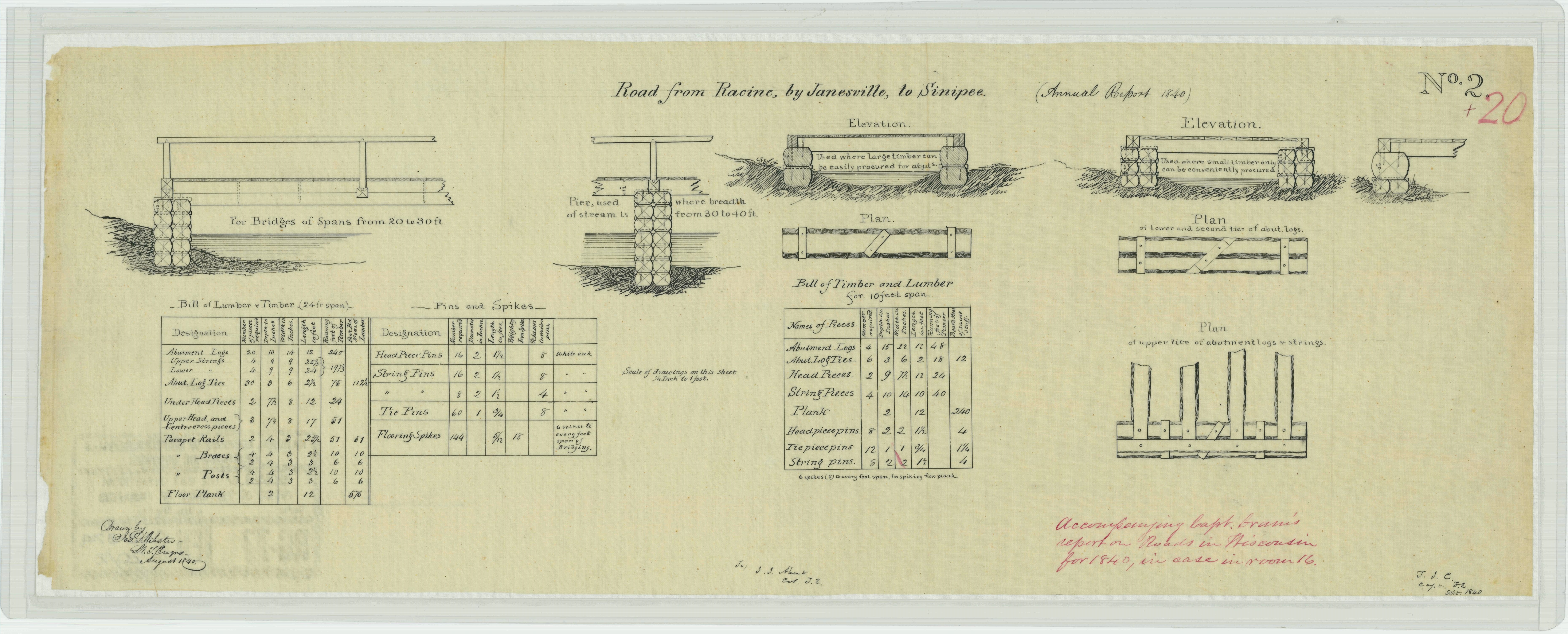 The second “Road from Racine by Janesville to Sinipee (Wisconsin)” document includes additional elevations and plans for various types and spans of bridges, and detailed lists of lumber, timber, spikes and bolts used in their construction.
