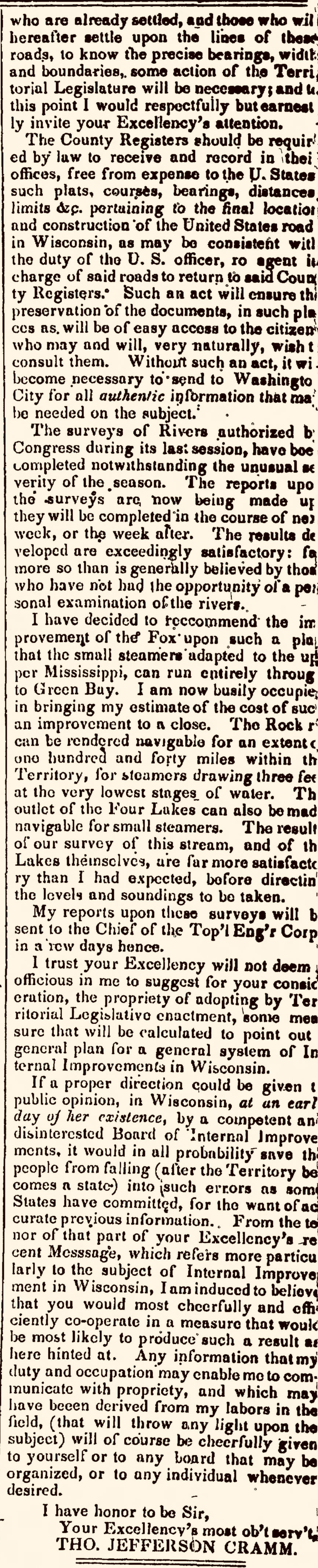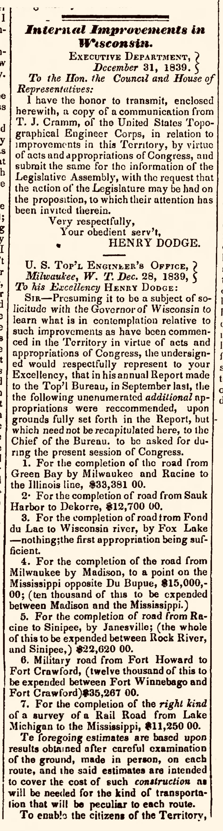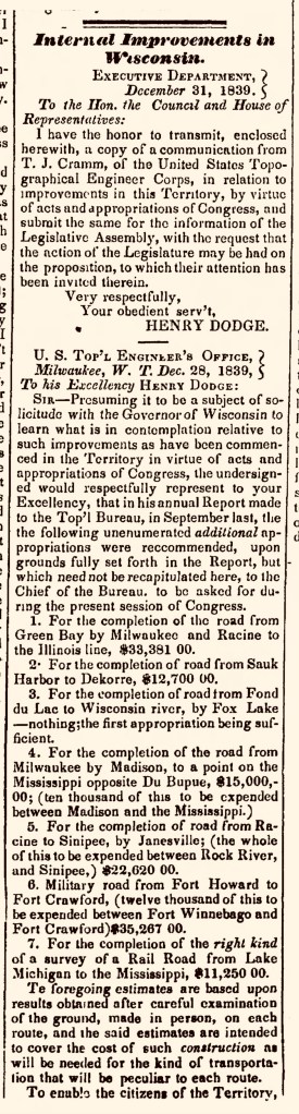 And if you were wondering about U.S. Army topographical engineer Capt. Thomas J. Cram, and his report to the Topographical Bureau and subsequently—in early 1840—to the U.S. Congress regarding the progress of Wisconsin’s federal roads, here’s a summary of that report, as sent by Capt. Cram to territorial governor Henry Dodge in late 1839 and published, with Dodge’s endorsement, on page 1 of the [Kenosha] Wisconsin Democrat (sometimes known as the Telegraph-Courier) on January 14, 1840.2
