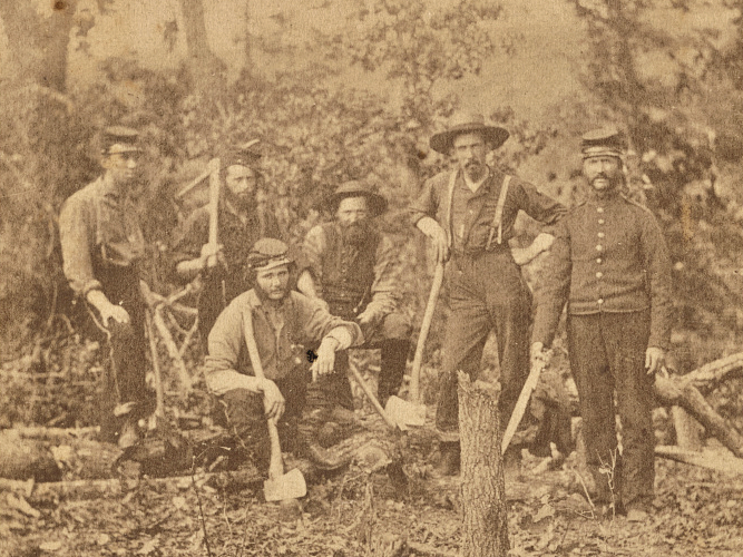 Unknown photographer, Six officers of 21st New York Infantry Regiment clearing for a camp at Upton’s Hill, Virginia,in fatigue dress with axes. Arlington County, Virginia, 1862. Library of Congress