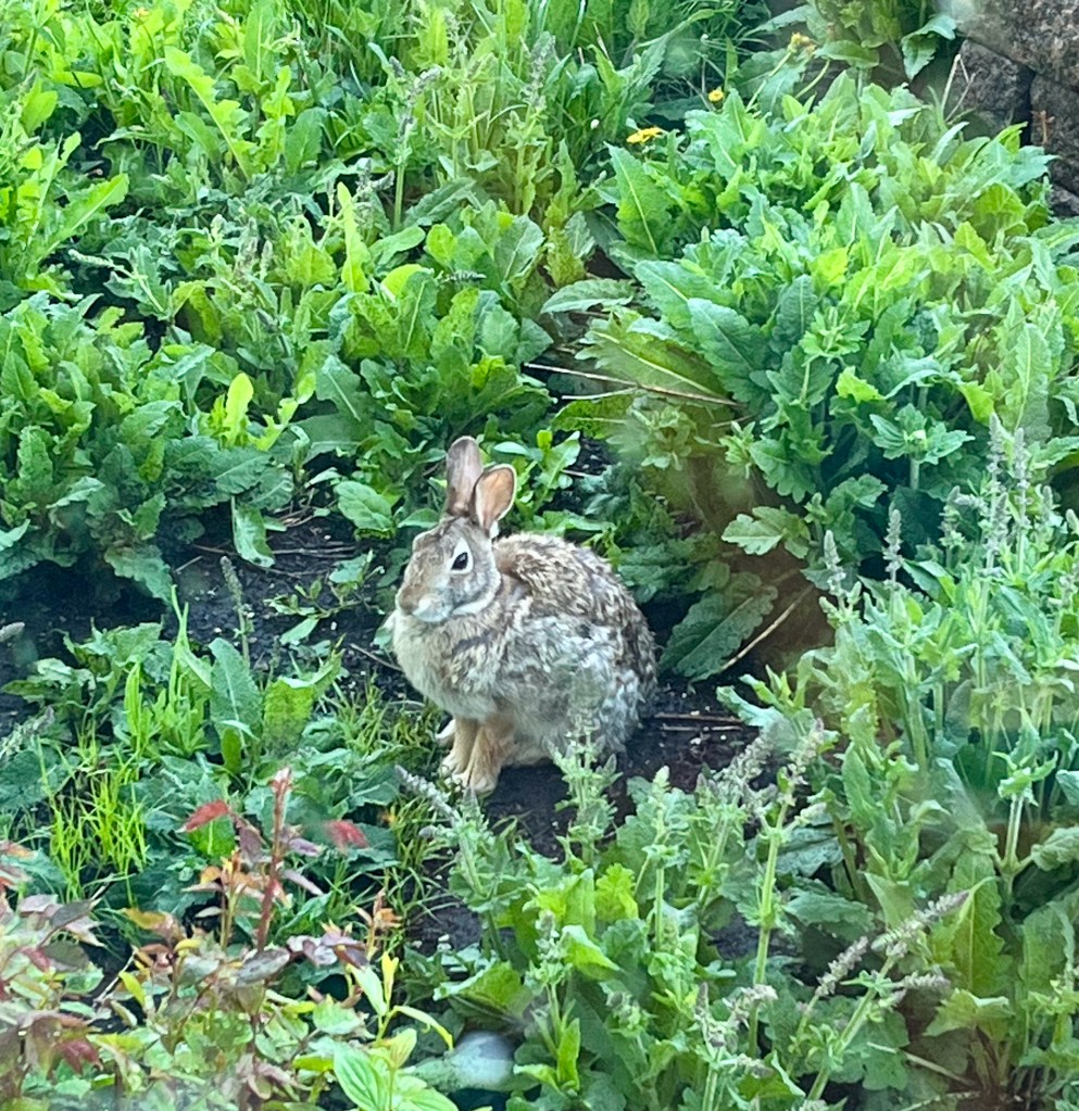 “Eating salad after the rain”– Rabbit in the roses and salvias. Photo credit: Laura Rexroth, 2024.